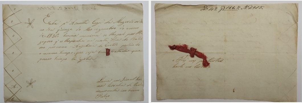 Includes a drawing of a cross, as well as a devotional scapular (bentinho) of Our Lady of Mount Carmel, of brown linen embroidered with pink, blue and red thread.
