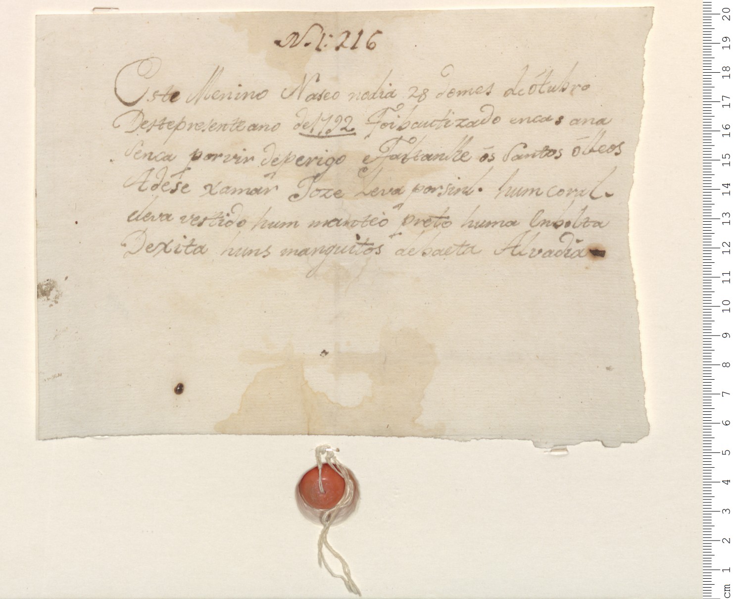Âmbito e conteúdo: Criança do sexo feminino, filha de pais incógnitos, batizada no dia 12 de Fevereiro de 1816 pelo padre António Soares do Amaral, cura da freguesia de Santo Estêvão de Alenquer.