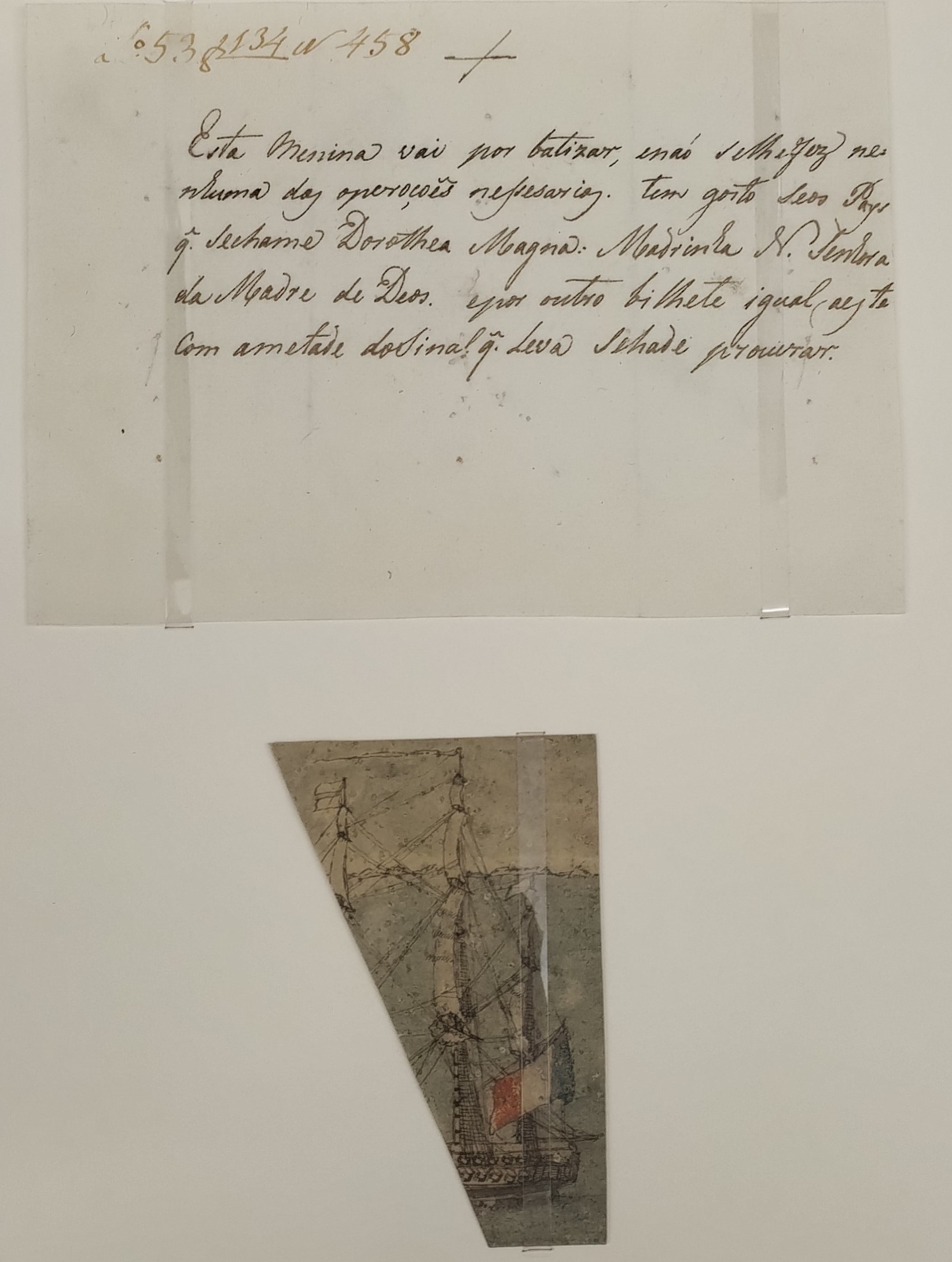 Dimensão e suporte: 1 fl.; papel, tecido e nácar.
