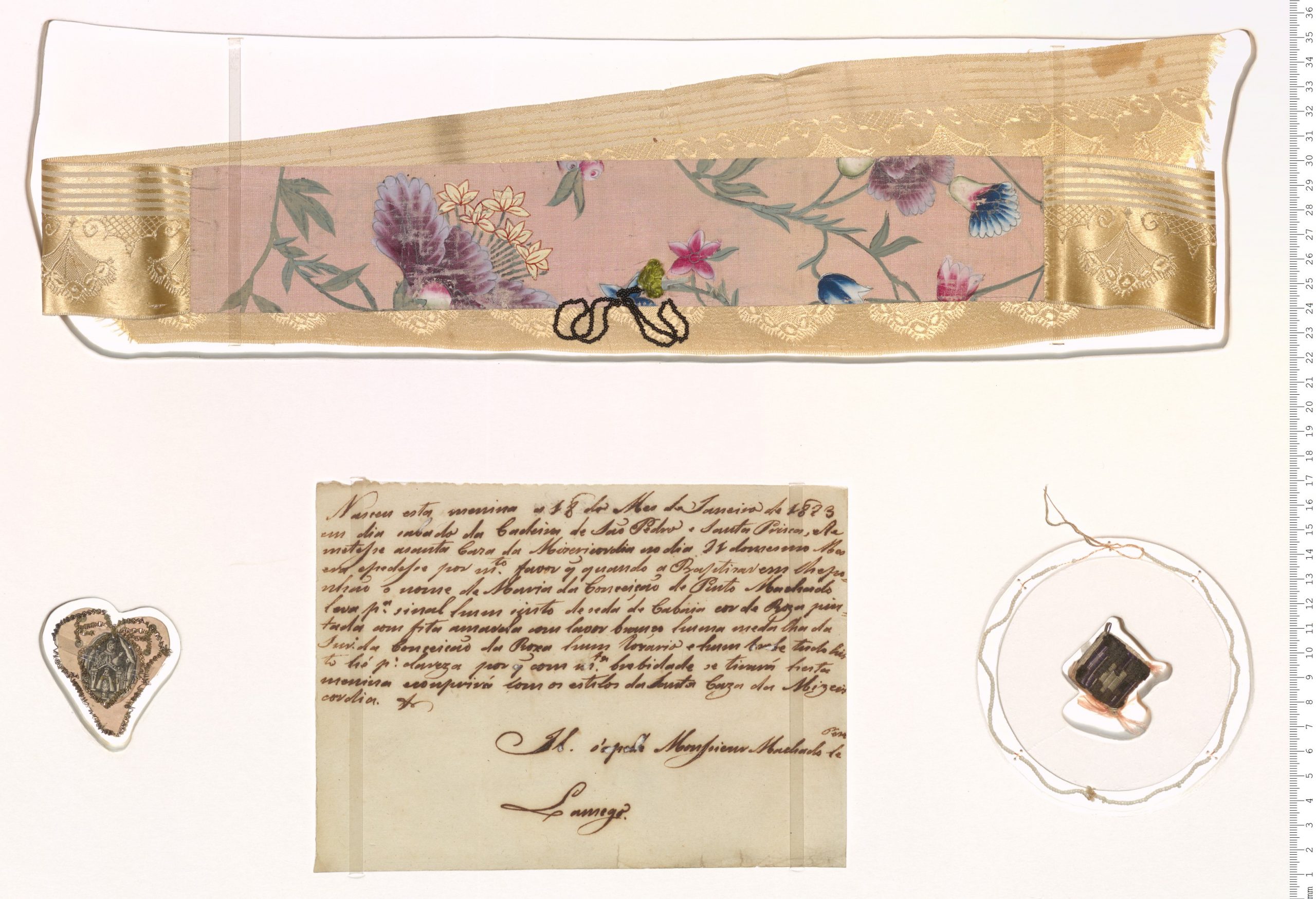 Inclui dois pedaços de tecido, um encarnado, castanho e branco, com motivos vegetalistas, e outro de lã castanho, bem como uma fita listrada azul e cor-de-laranja.