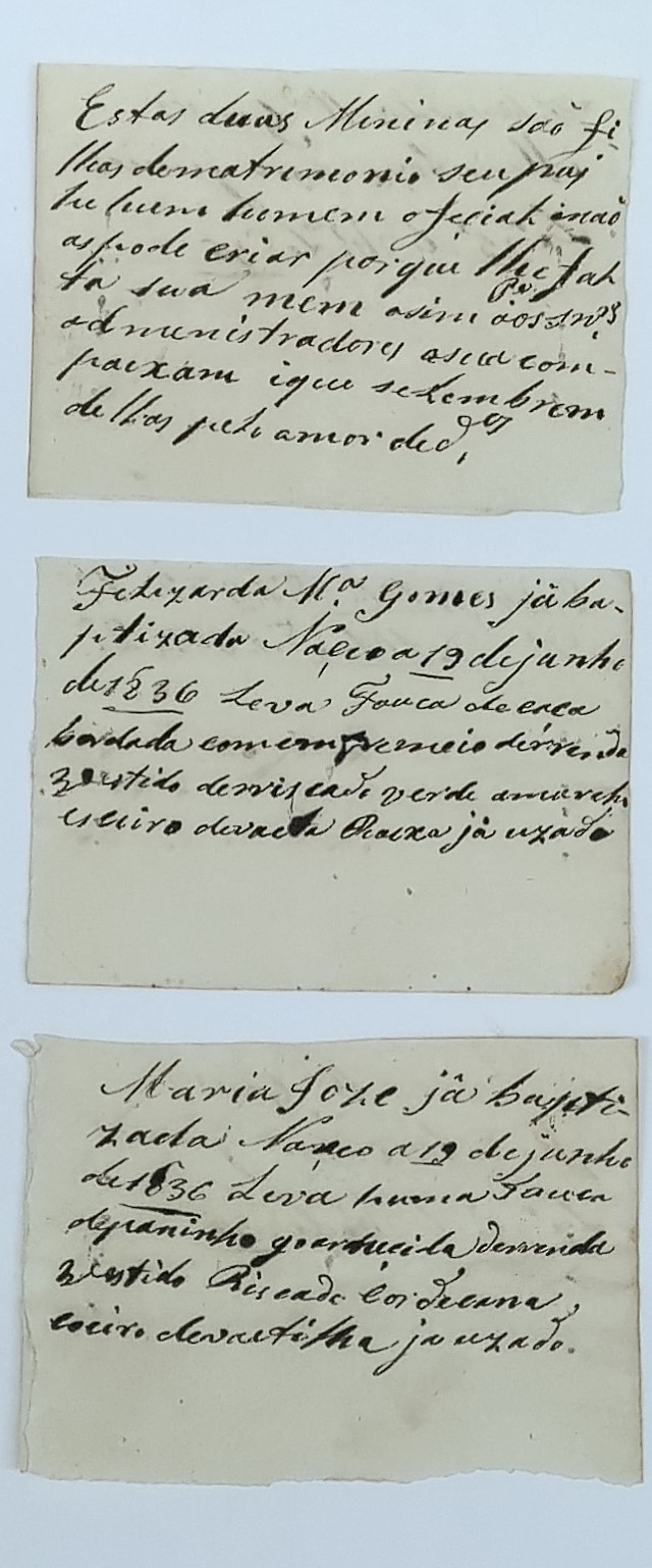 Inclui dois bilhetes com referência à data de nascimento das crianças e respetivo enxoval.