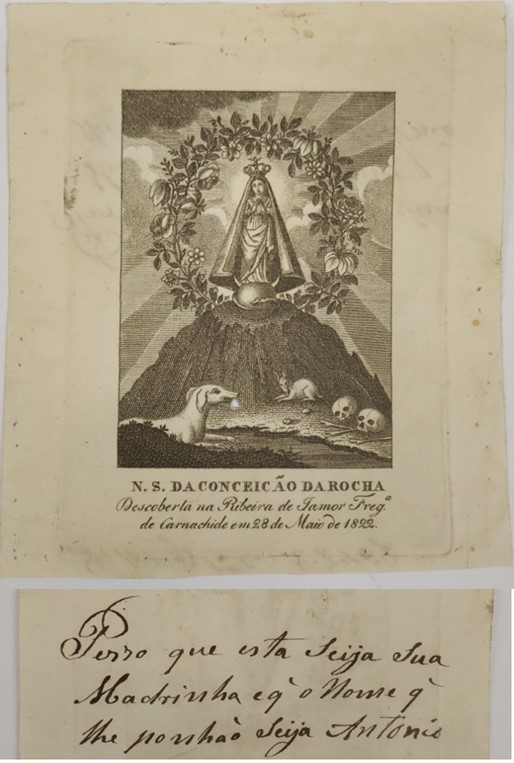 Integra, ainda, um bentinho com fita encarnada, debrum metálico e papel impresso no interior.