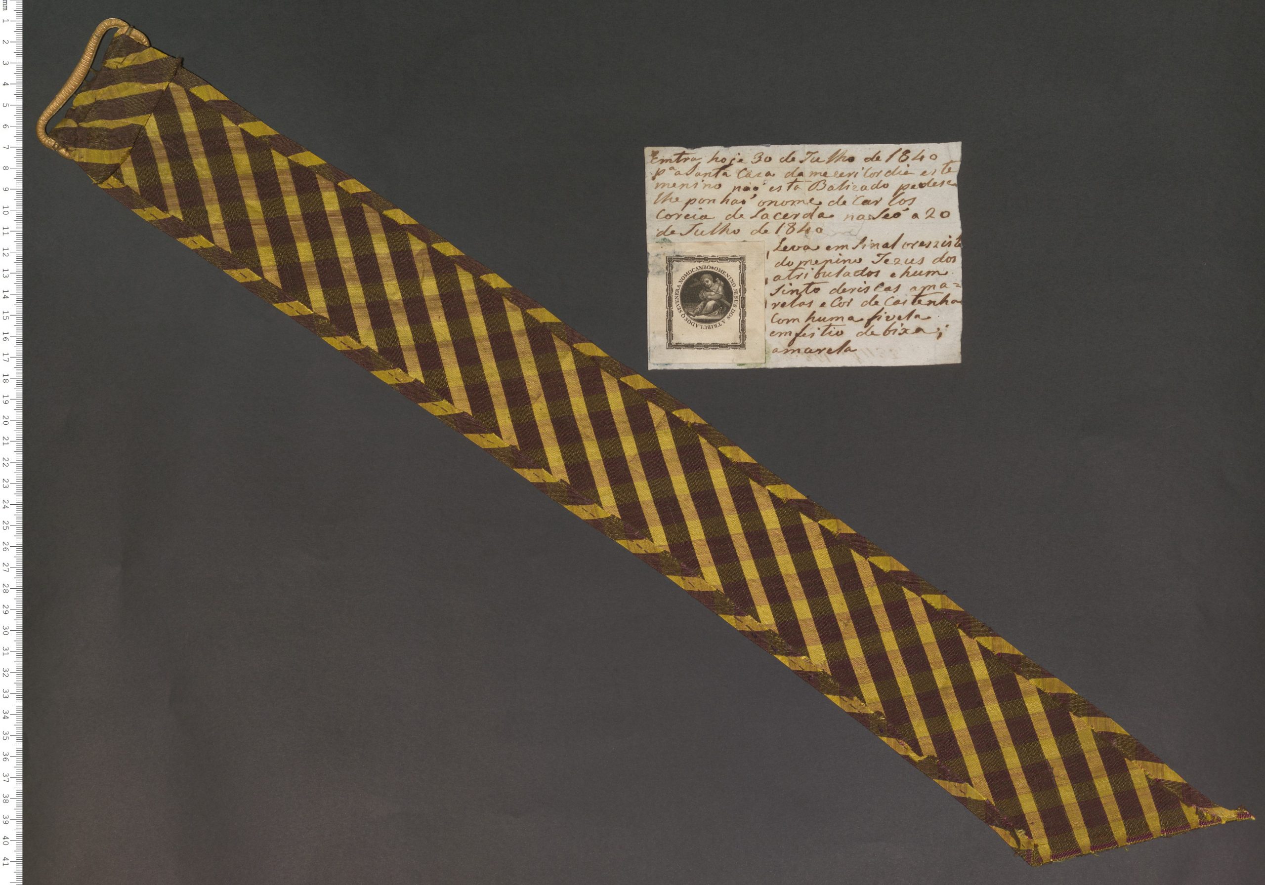 Inclui uma gravura do Menino Jesus dos Atribulados, bem como um cinto de seda listrada amarela e castanha, com uma fivela de metal amarelo em forma de serpente.