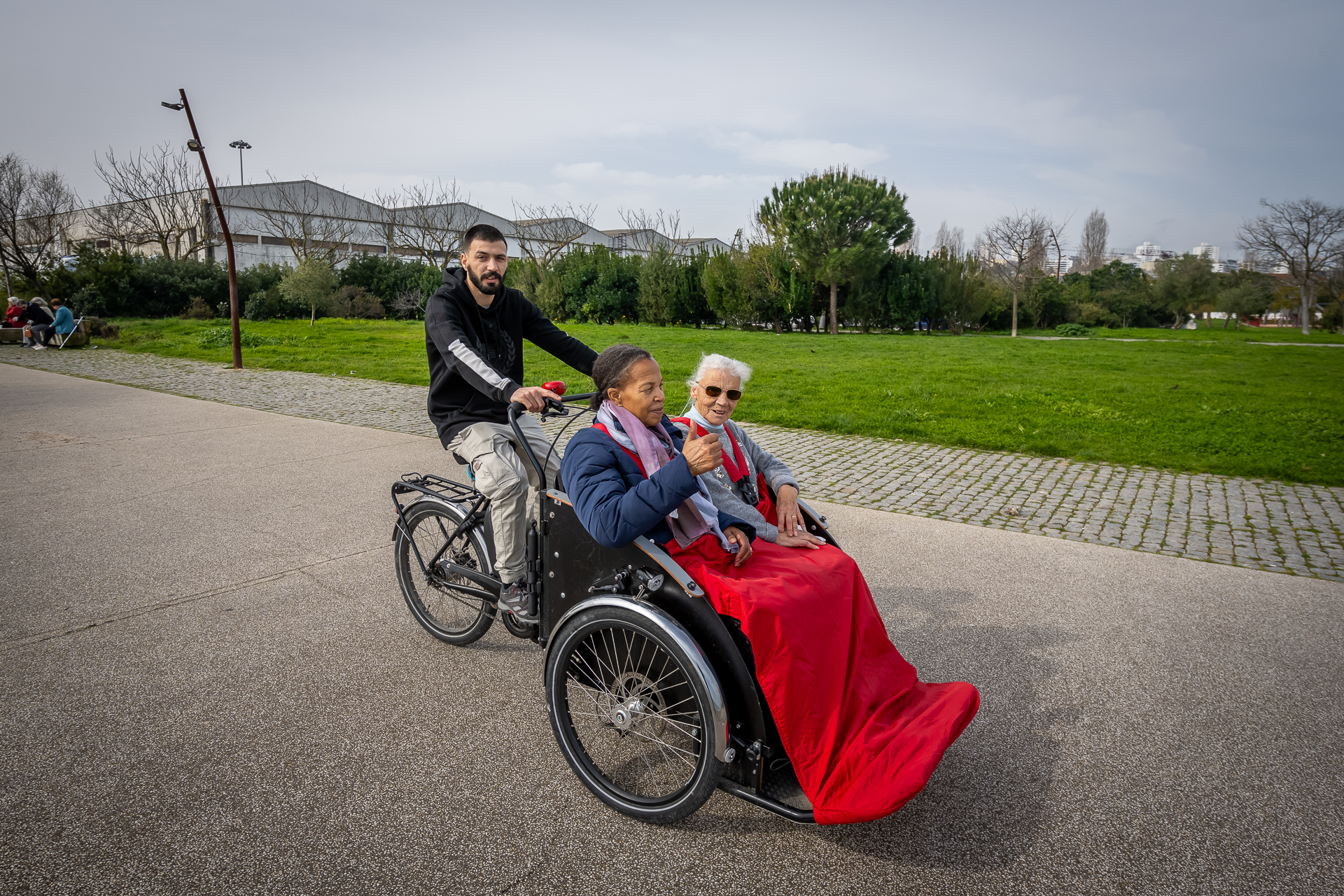 No centro da atividade está uma bicicleta diferente. Adaptada, robusta, pensada para quem tem mobilidade reduzida ou nunca teve oportunidade de pedalar. Luís Reis, responsável pelo Centro de Promoção Social da PRODAC, equipamento da Santa Casa, e o condutor, desta vez, da bicicleta, explica e exemplifica: “O estrado baixa para facilitar a entrada”, sendo que há todo um pequeno ritual antes da partida: verificar a segurança, ajustar os apoios para os pés, colocar uma mantinha para proteger do frio e oferecer um chá quente, feito propositadamente para a ocasião.