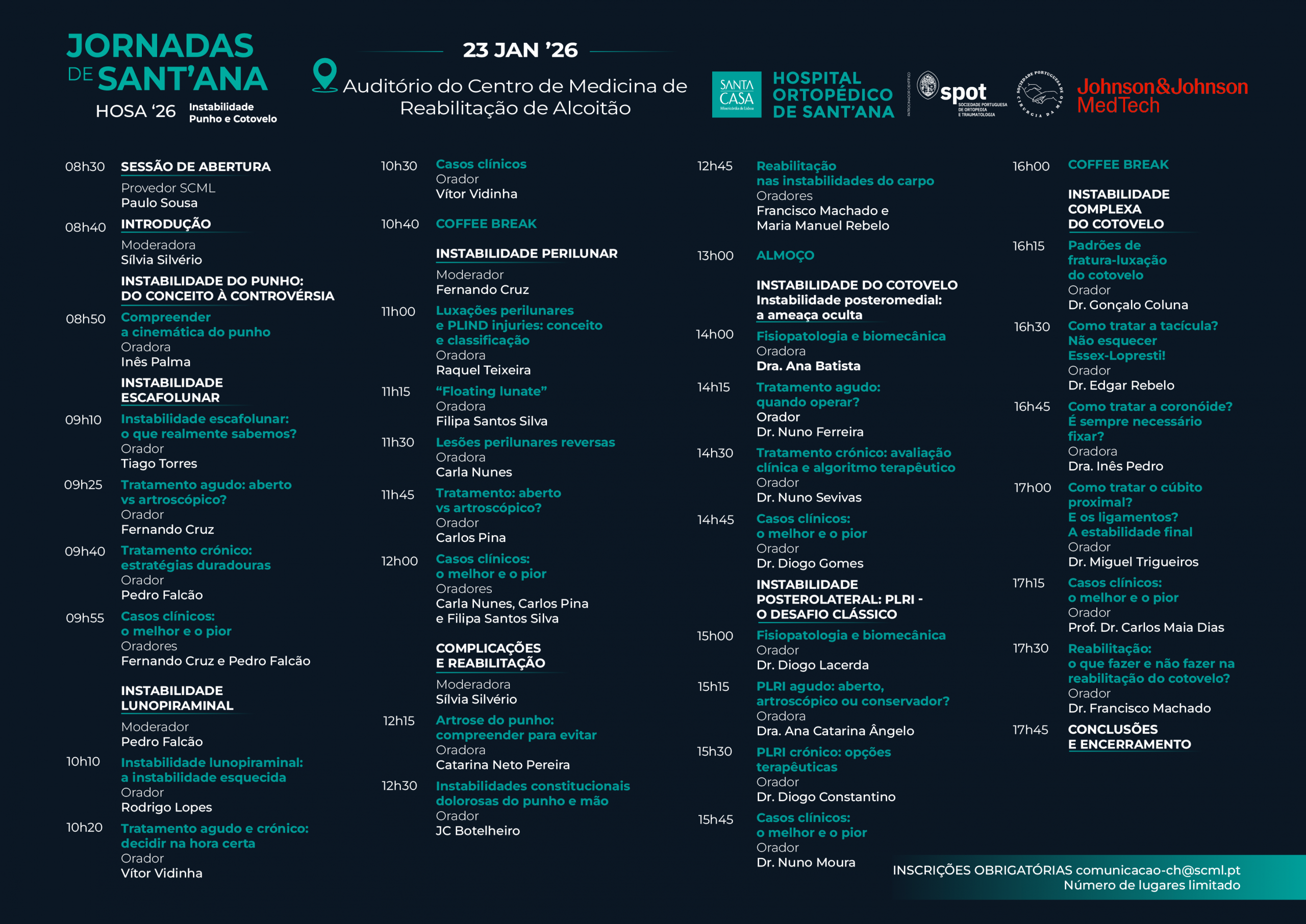 O Hospital de Sant’Ana, equipamento do Centro Hospitalar da Santa Casa da Misericórdia de Lisboa, vai realizar, em colaboração com a Sociedade Portuguesa de Ortopedia e Traumatologia, mais umas Jornadas de Sant’Ana, este ano subordinadas ao tema Instabilidade Punho e Cotovelo.