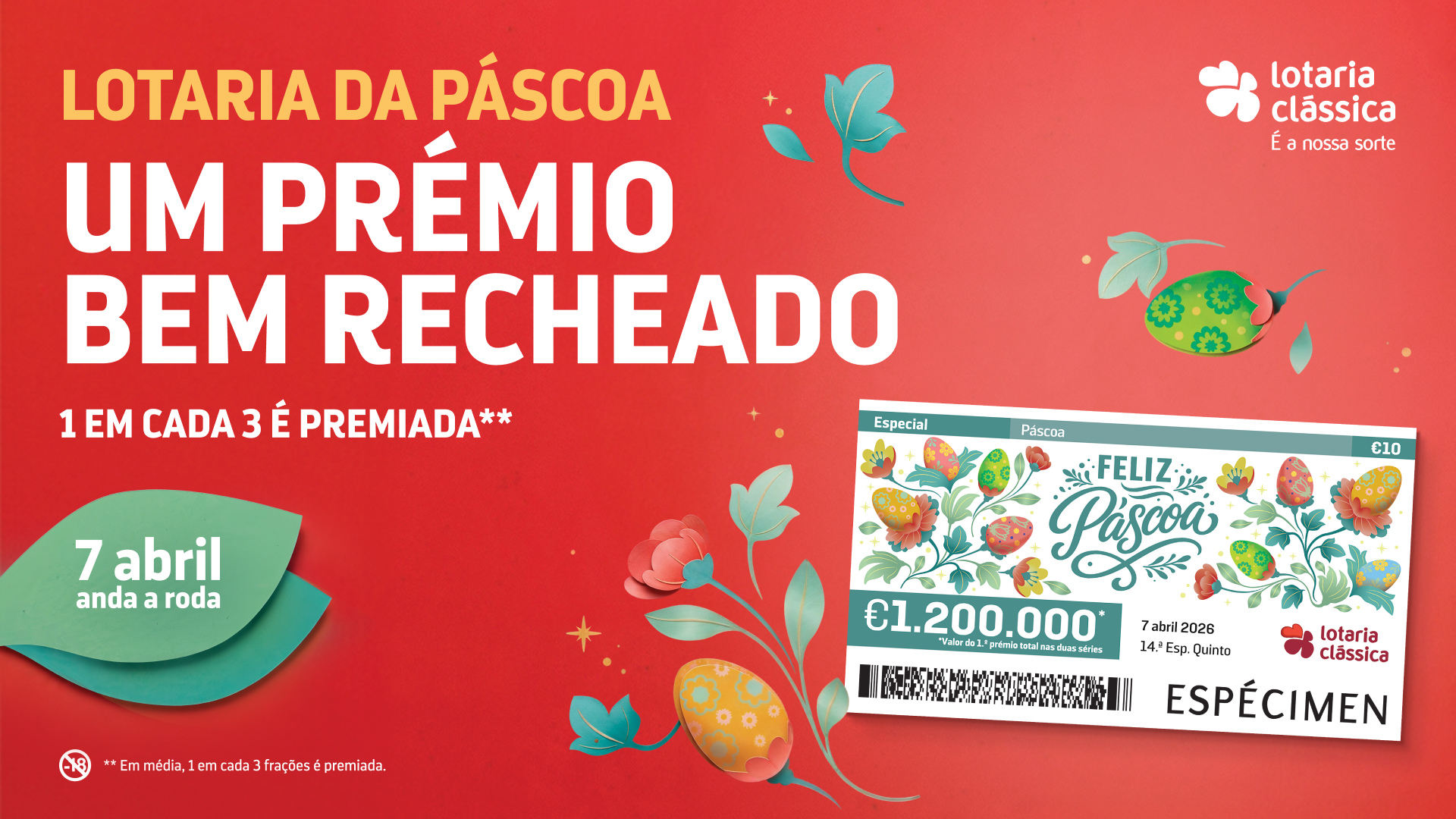 “Um prémio bem recheado” é o slogan da campanha que “arrancou” na sexta-feira em diversos meios de comunicação, estando “no ar” até ao próximo dia 7. Com esta simples frase, a campanha da Lotaria Clássica Especial da Páscoa anuncia que esta é uma oportunidade de se ganhar um prémio elevado, recordando ainda que, em média, uma em cada três frações da lotaria é premiada.