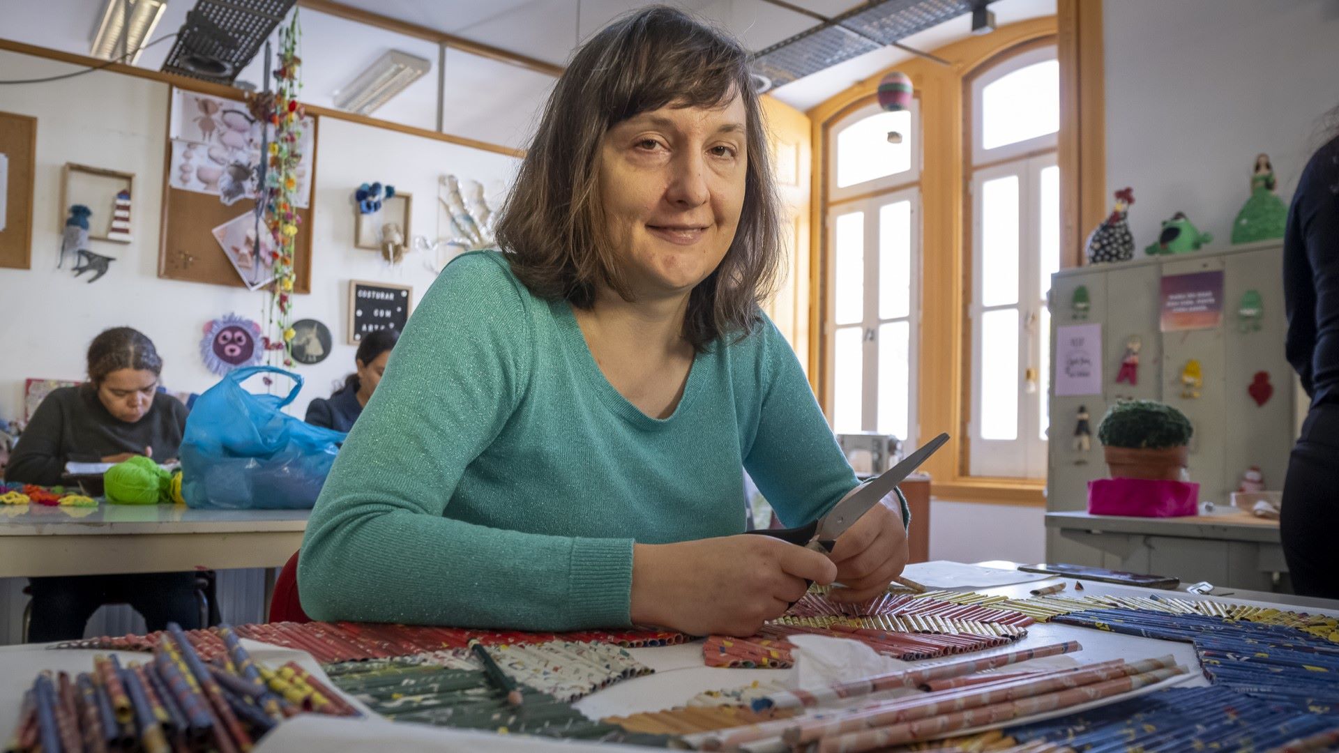 Catarina descreve-nos alguns dos rostos e das mãos que contam histórias: “A Jéssica dedica-se ao detalhe, cria peças muito delicadas, quase frágeis, mas cheias de força interior. Já o Ilídio, apesar de algumas limitações de motricidade, encontrou na pasta de papel a possibilidade de criar em grande escala.”