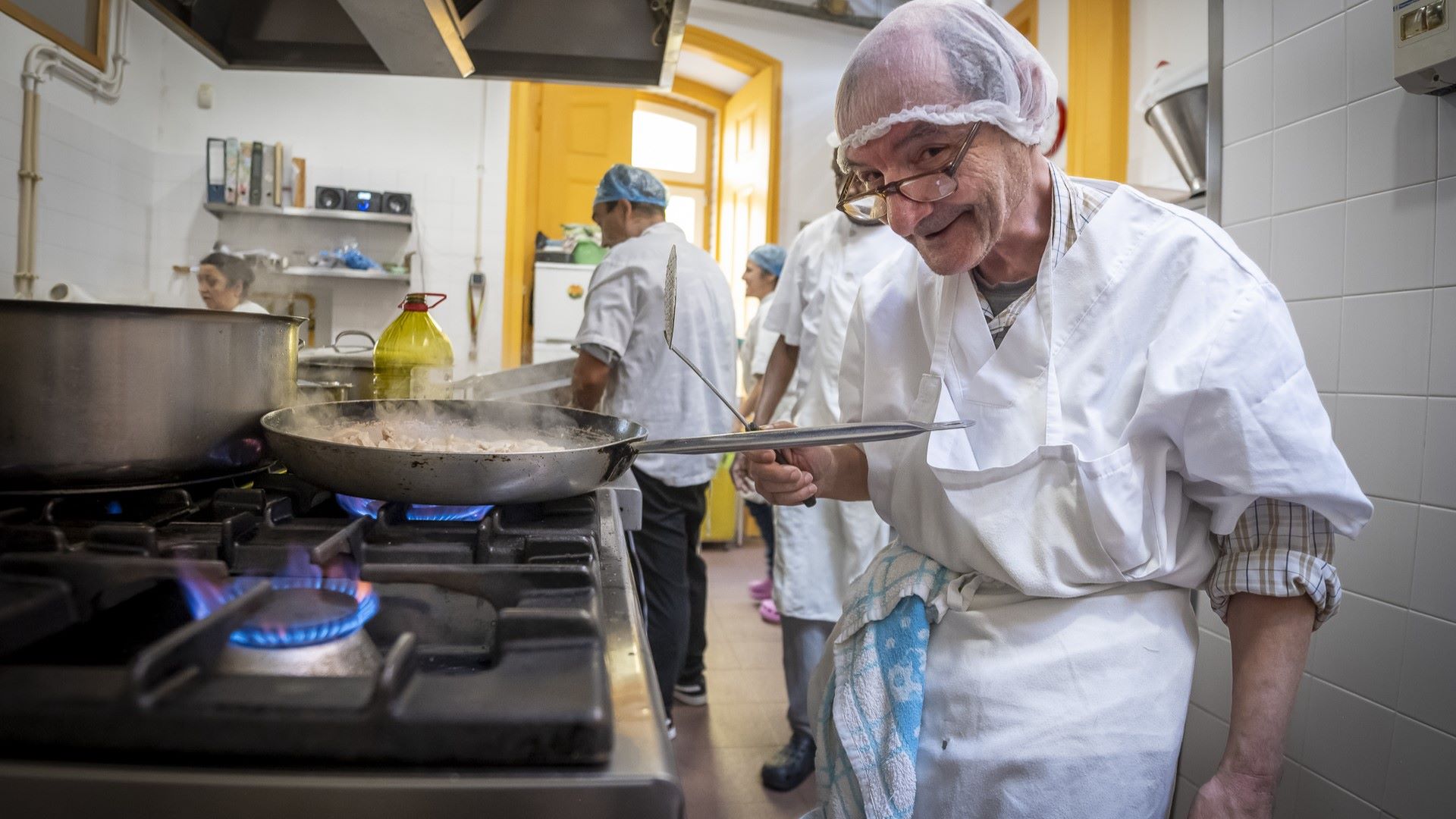 No primeiro andar do Centro, temos a cozinha, liderada pela chef Lucinda, e na qual seis utentes preparam perto de cem refeições diárias. O cheiro dos tachos enche o espaço, mas o que realmente se sente é o orgulho. Como o do Sr. Coelho que faz este trabalho há 28 anos, ali.