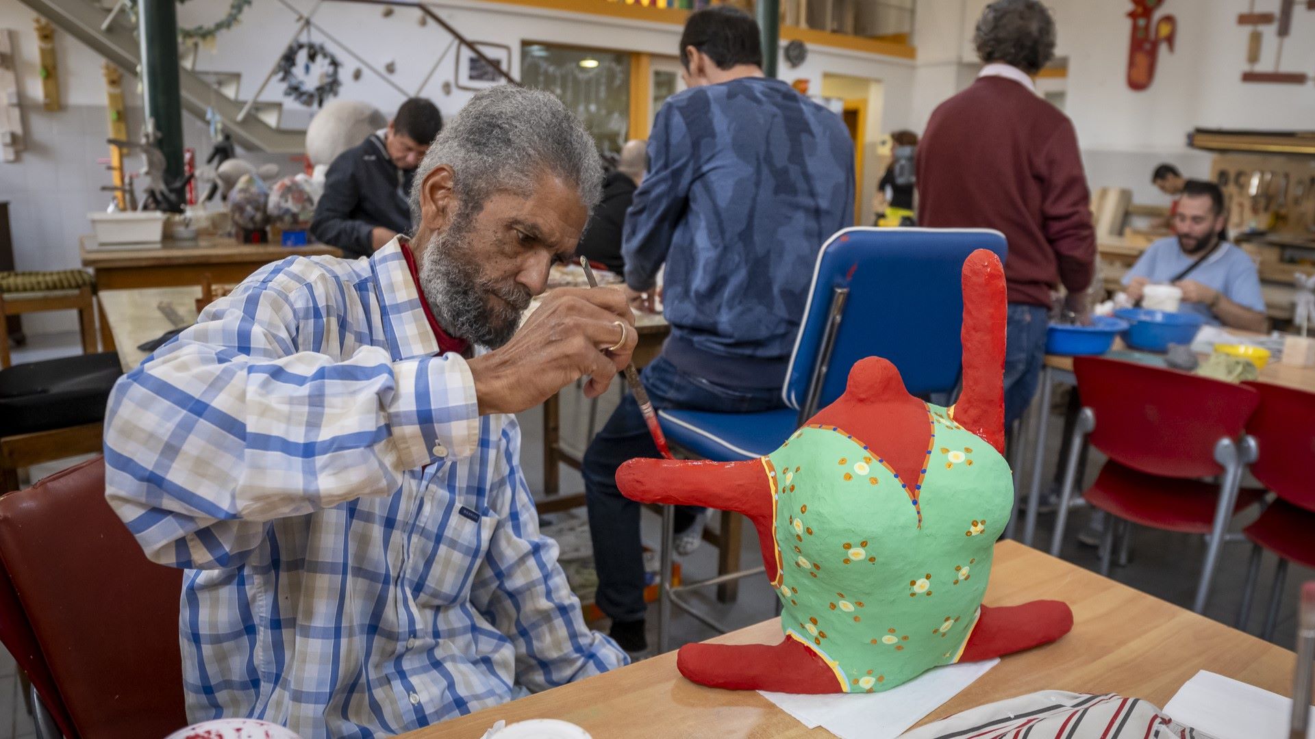 No rés-do-chão, o som da madeira a ser trabalhada mistura-se com conversas e risos. Paulo, monitor, orienta os utentes na carpintaria, pintura e trabalhos manuais. Aqui, a maioria são homens. Alguns trazem consigo experiências de vida que se refletem no trabalho. Como o Miguel Vivas, antigo serralheiro civil, que reencontrou na madeira uma forma de expressão. Se um utente não se sente à vontade num ateliê, pode mudar. Porque o CASSB acredita que cada pessoa merece encontrar o espaço onde se sente segura e confiante.